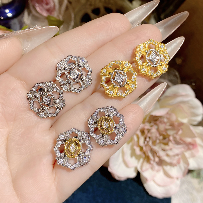 ツバキの欧米のフランス式の精工のヴィンテージの紋様の彫刻の金のピアスは金をめっきしてジルコニウムのドリルのcuicの復古の耳飾りを入れます。