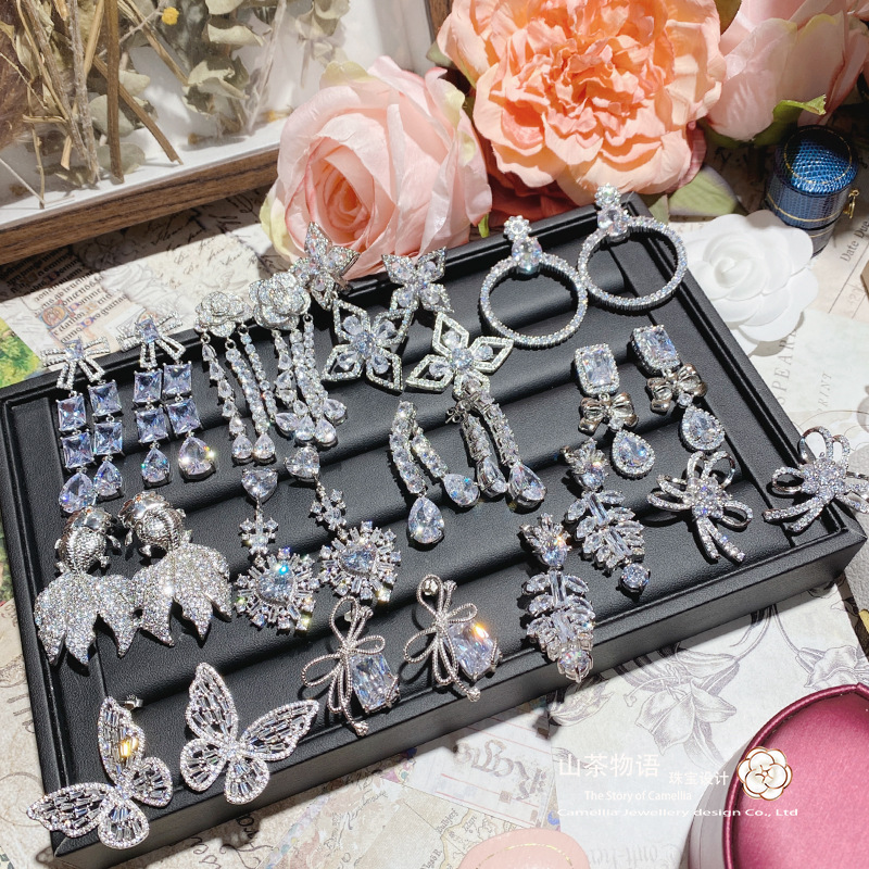ツバキの新商品の豪華なきらきらと輝く色の宝の黄金のジルコニウムの耳飾りは18kの優雅な貴気の高級な精巧な銀の針のピアスをめっきします。