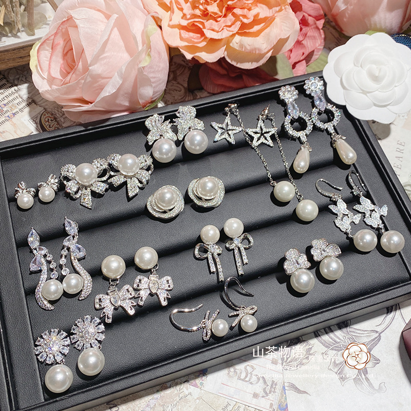 ツバキの新型の軽豪華な名媛の気質の蝶結びの真珠の耳飾りの高級な精巧な銀の針の貝の玉のイヤリングの卸売り