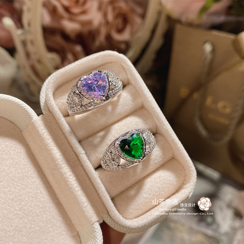 ツバキの国境を越えたレトロな祖母の緑の宝石のハート型の指輪の女性の骨董感は18kの金の超閃光の薄い紫のジルコニウムの指輪をめっきします。