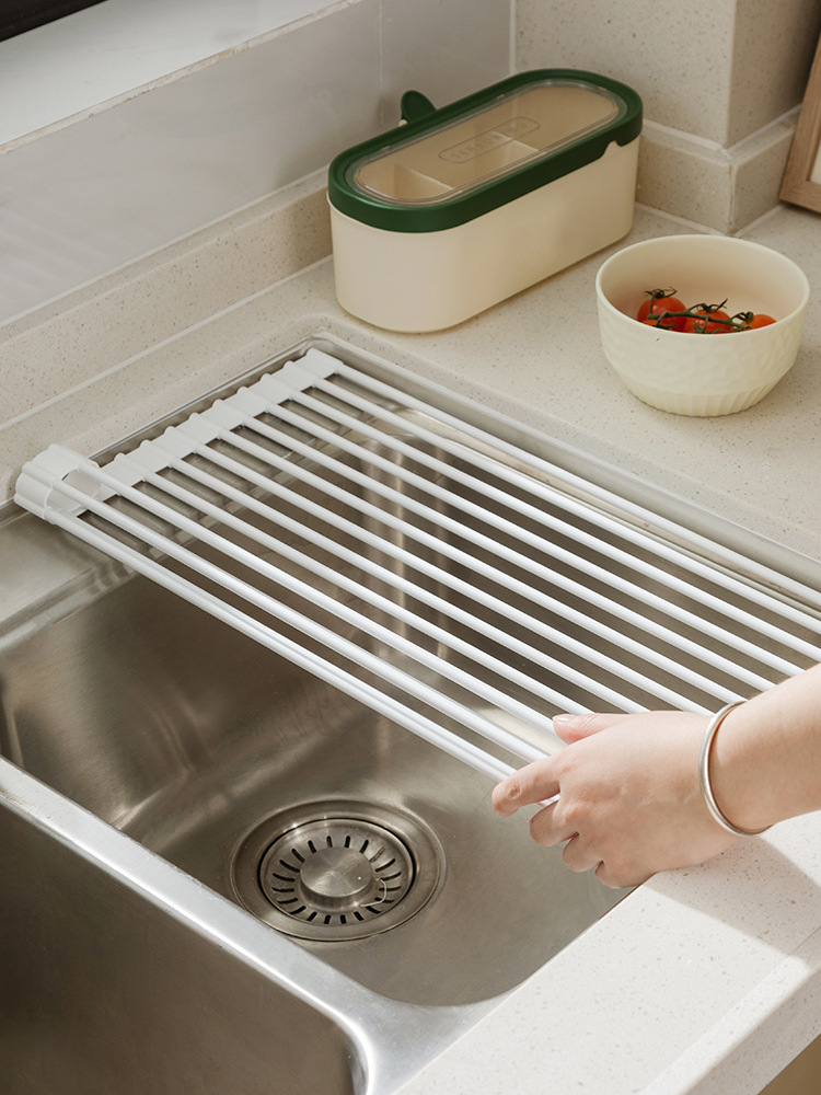 台所の池のローラーのカーテンの棚のシリコンの折り畳みの水切りの棚の食器を洗う物の棚の赤ちゃんはお尻を洗います。