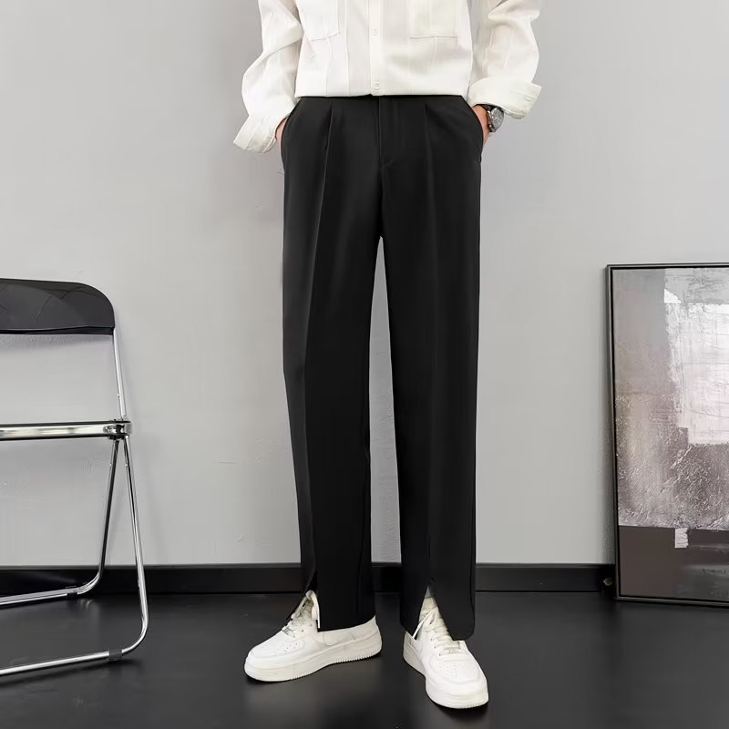 ズボンの男性のオープンフォークの高い街のズボンの香港風のファッションの百合のストレートの筒のモップのズボンのペンダント感のゆったりしている広足のズボンの男性