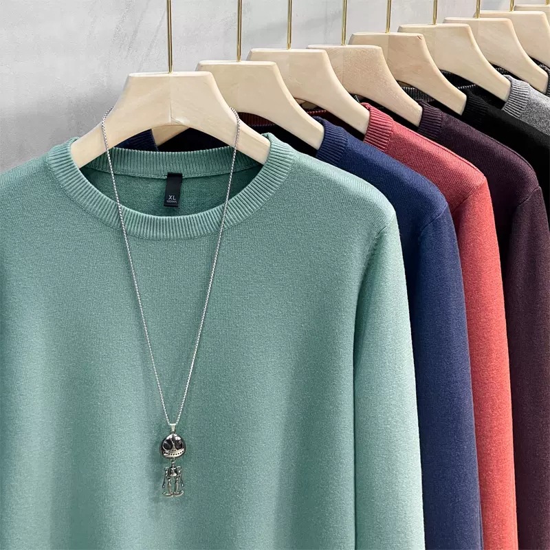 春と秋の純色の丸首のセーターの男性は簡単に身を修めます。
