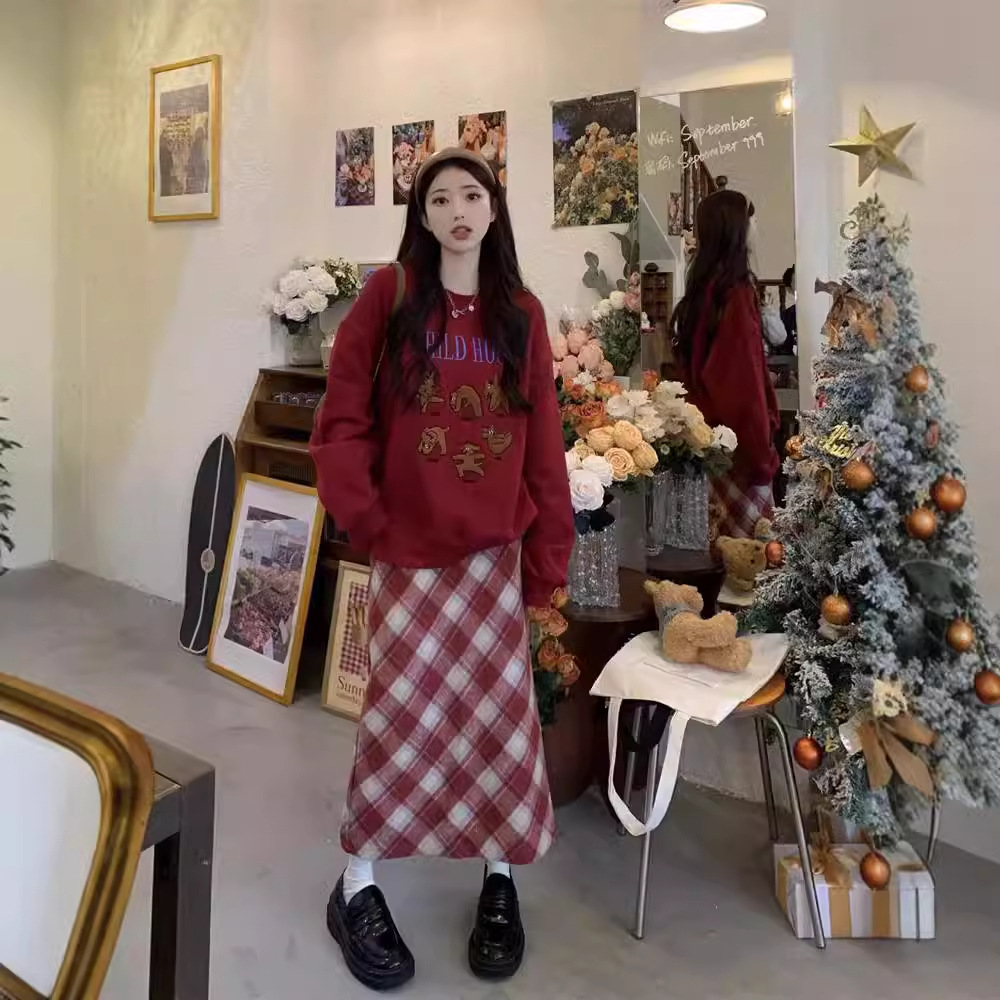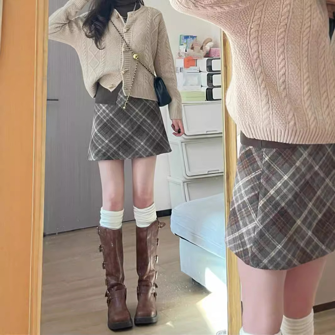 大きいサイズの2024年の秋の毛は格子の後でフォークの半スカートの女性がやせているナシの形の体高の腰のA字のスカートを現します。