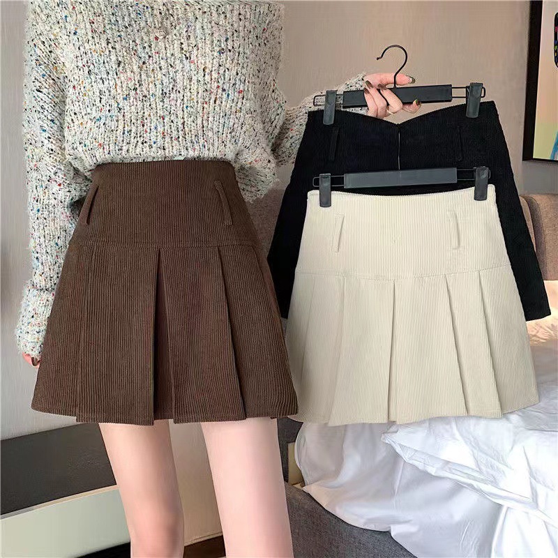 大きいサイズの太ったmmのコーデュロイのプリーツのスカートの女性の秋の2024年の半身のスカートの高い腰はやせていて、光のa字のショートスカートを防ぎます。