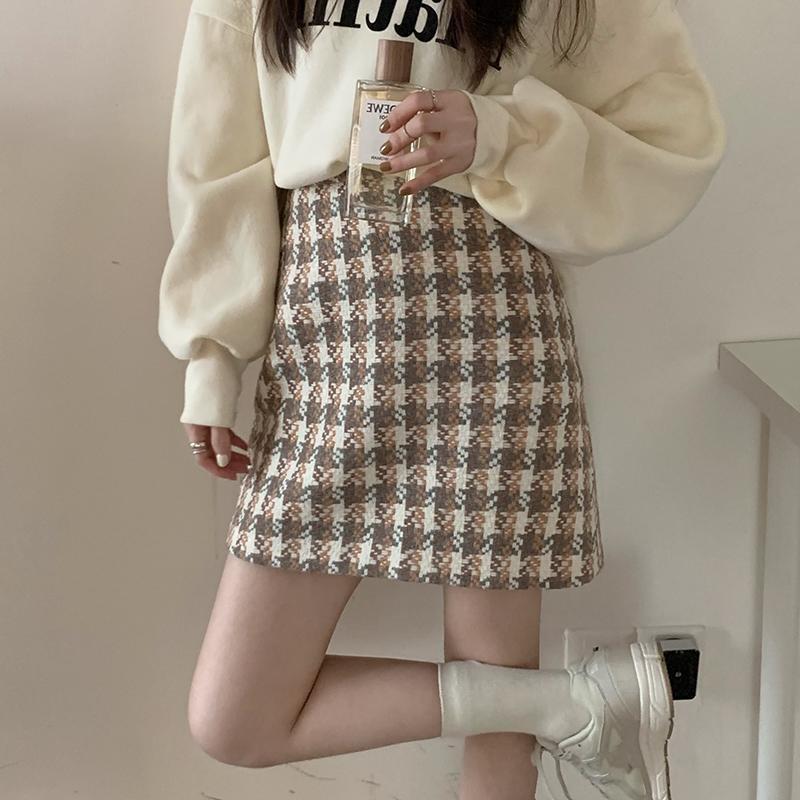 大きいサイズのレトロな毛の格子の半身のスカートの女性の太っているmmの秋の新型の高い腰の小さい背はお尻を包んで光の短いスカートを防ぎます。