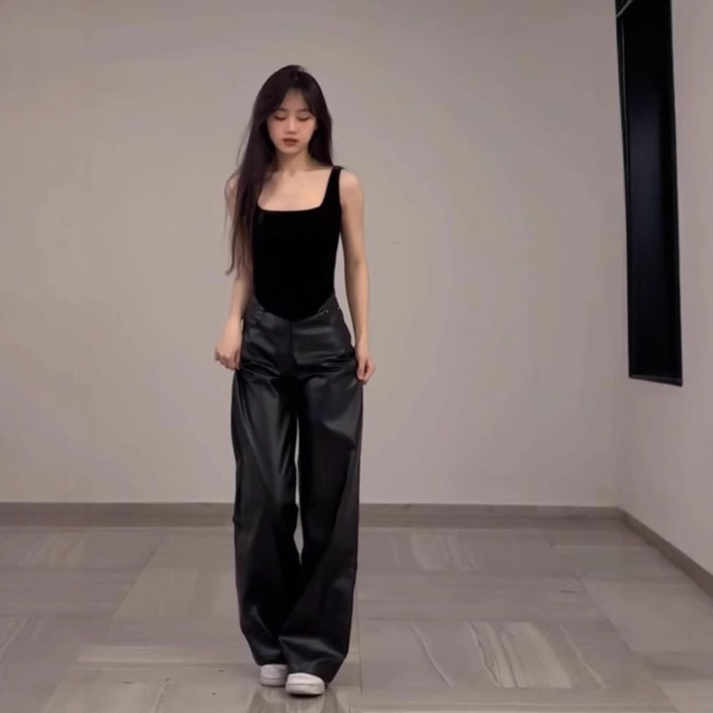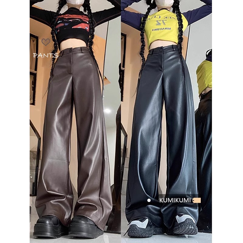 大きいサイズの太ったmmのアメリカ式の黒いpuの皮のズボンの女性の秋の高腰のゆったりしているデザイン感の広い足のモップのズボンのストレートなズボン