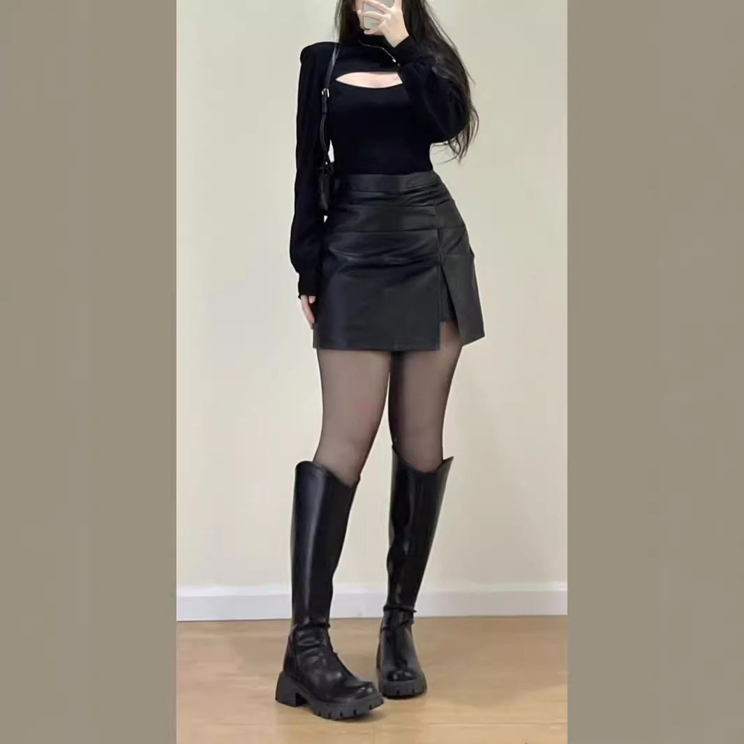 ギャルの黒い皮のスカートのしわの半身のスカートの女性の早秋の大きいサイズの太っているmmの高腰のa字のデザイン感のpu皮のa字のショートスカート