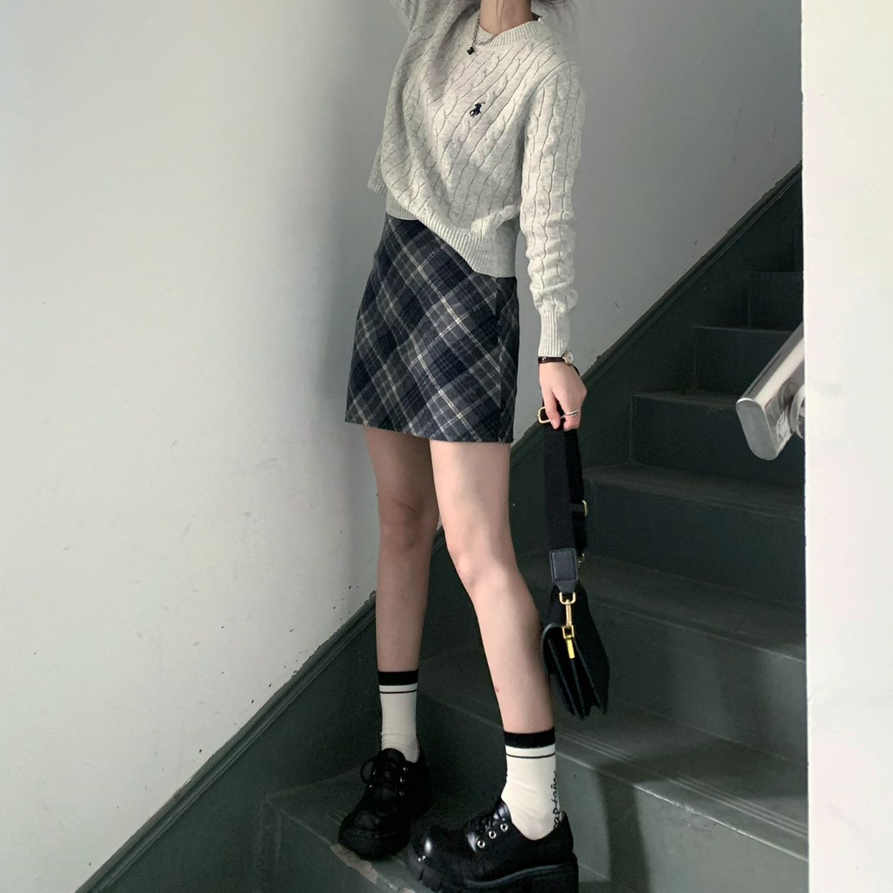 格子の毛の半身のスカートの女性の秋の復古の学院の風の大きいサイズのナシ型の体つきの高い腰のA字はお尻の短いスカートを包みます。