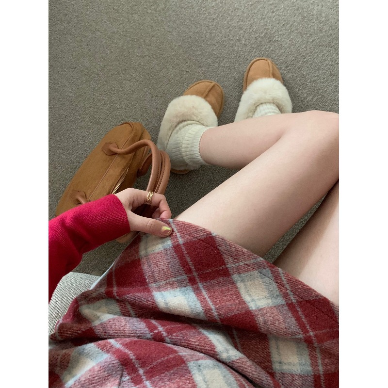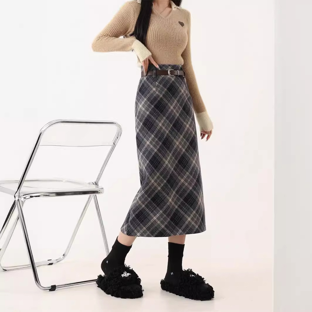 大きいサイズの太ったmmの赤い格子縞の毛は半身のスカートの女性の秋の2024の新型の高い腰はやせている気質のa字のスカートを現します。