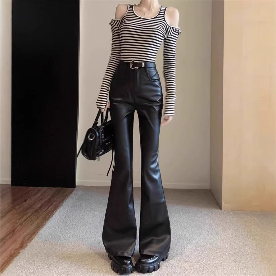 梨の形の体つきpuの皮のズボンの女性の秋の新型の大きいサイズの太っているmmのゆったりしているストレートなズボン