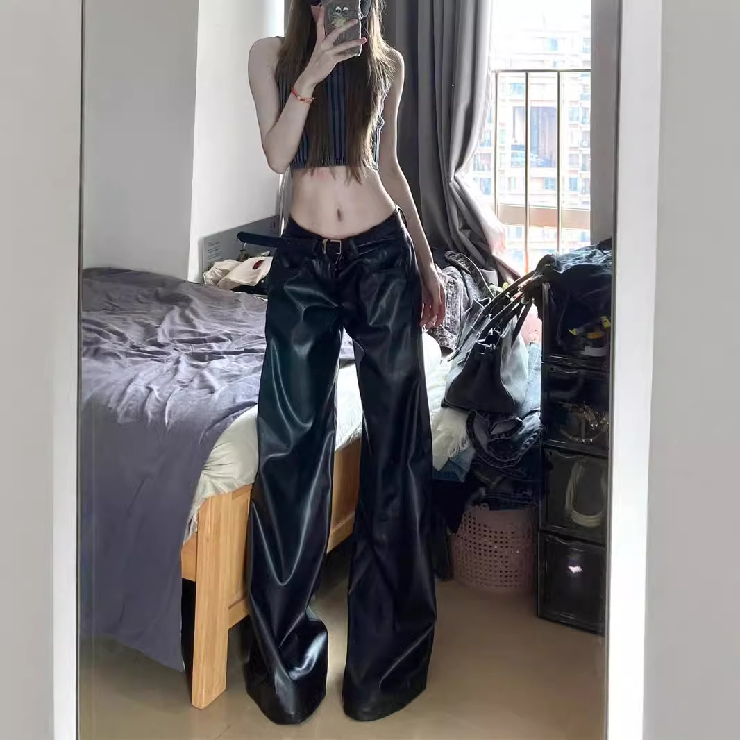 アメリカのレトロな黒色の低い腰の皮のズボンの広い足のズボンの女性の大きいサイズの太ったmmの秋のギャルの欧米の風のpu皮のほのかなズボン