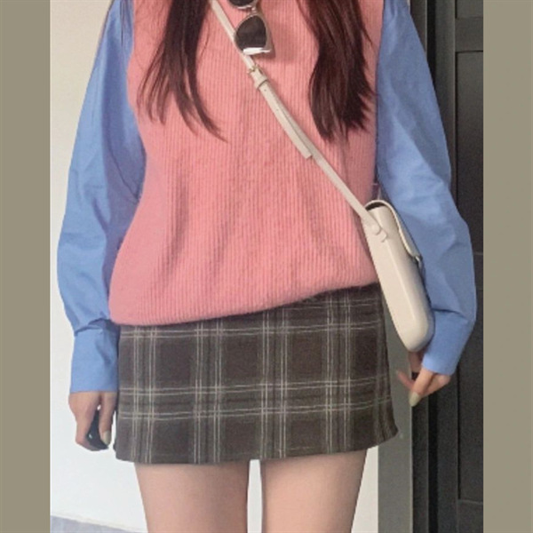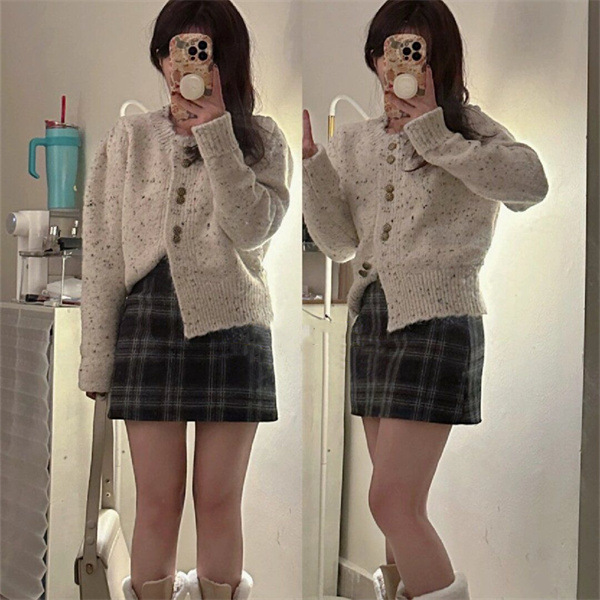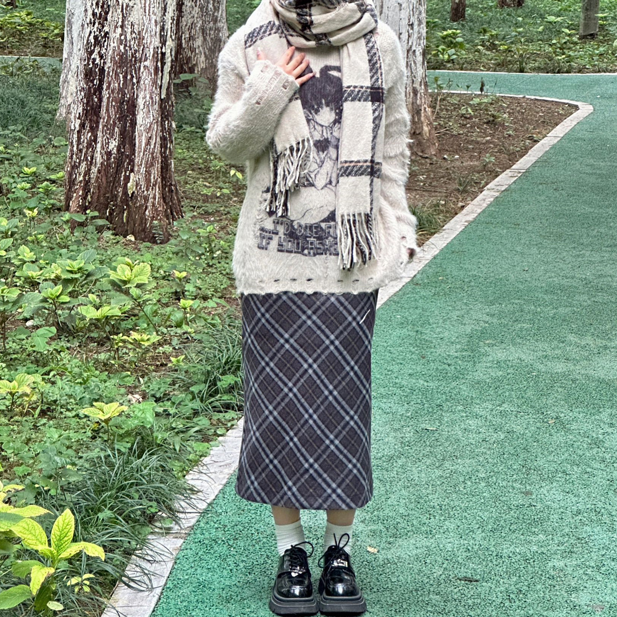 大きいサイズの太ったmmの高腰の格子の毛は半身のスカートの女性の秋冬にセーターの気質が現れて痩せています。