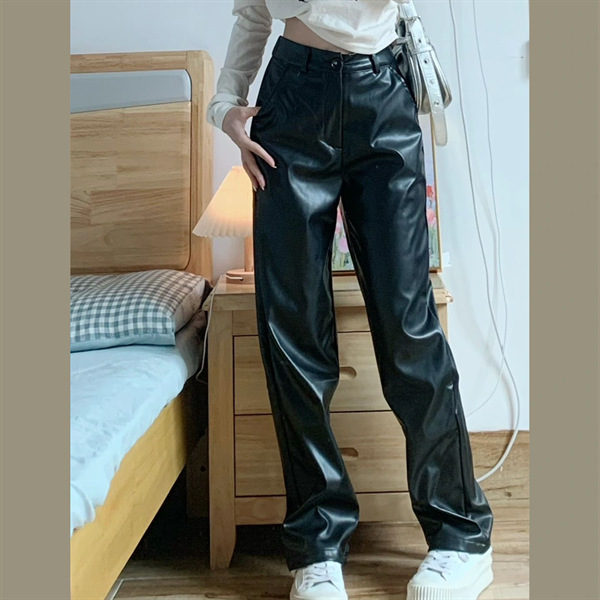 高級感のある黒い革のズボンのカジュアルなズボンの女性の秋の大きいサイズの太ったmmのゆったりしている高腰のストレートなズボンのpu皮のモップのズボン