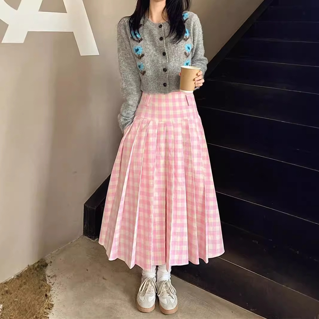 ピンクの格子の半身のスカートの女性の大きいサイズの太っているmmはやせている格好のスカートのA字の百のスカートの小さい背の半スカートのロングスカートを現します。