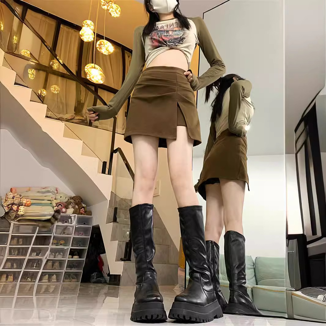 大きいサイズのカレー色の毛は半身のスカートの女性の夏の2024の新型の太っているmmはa字のスカートの高い腰を開けて肉を遮ってヒップのスカートを包みます