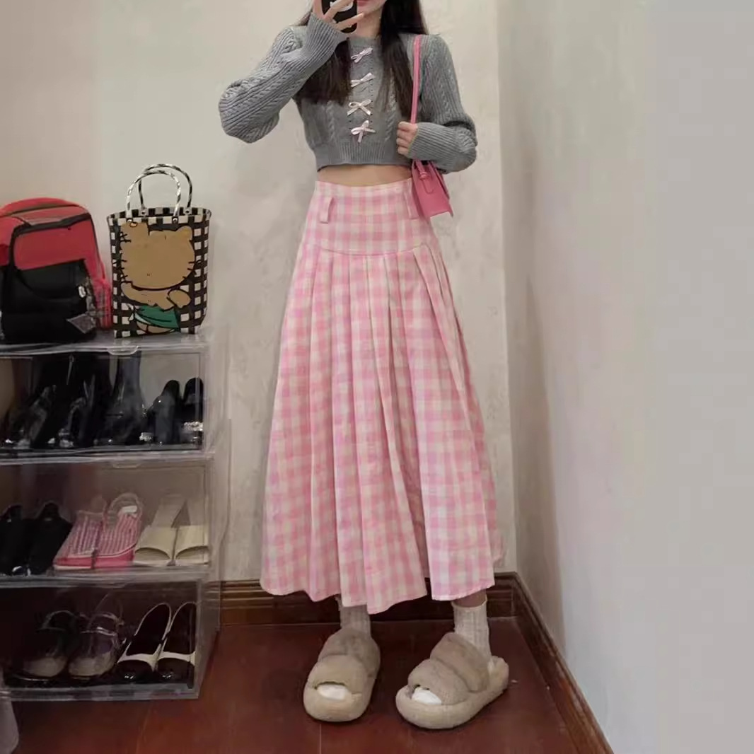 ピンクのチェック柄スカート レディース 秋物 大きいサイズ ぽっちゃりさん向け チェック柄Aラインスカート 着痩せ効果 デザイン性のあるプリーツスカート ロングスカート