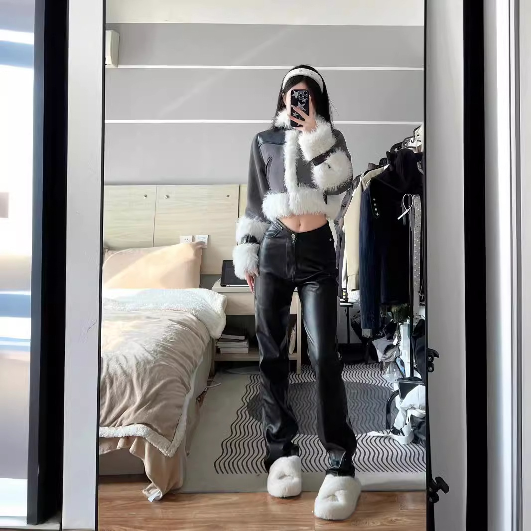 ワイド脚のズボンの女性の夏の新型の高腰pu皮の小さい体の垂れ下がった感の大きいサイズの太っているmmのつや消しの狭い版のストレートなズボンの女性