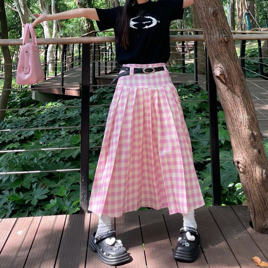大きいサイズの太ったmmの夏の学院の風の甘いピンクの格子の半身のスカートの女性の夏の高い腰はやせているa字の百合のロングスカートを現します。