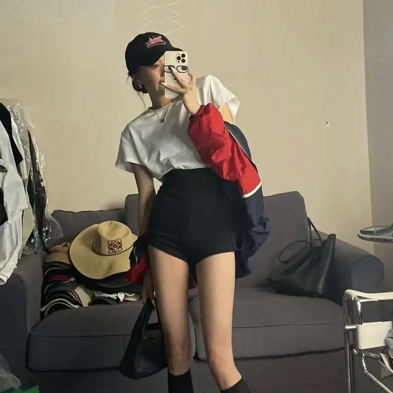 黒い腰の高いスーツの半ズボンの女性の大きいサイズの太っているmmの夏の外はギャルを着て足の長いのが見えます。