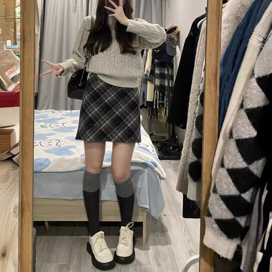 大きいサイズの毛の半身のスカートの女性の夏の2024年の小さい背のスカートの高腰のa字のスカートの太っているmmの格子のヒップのスカート