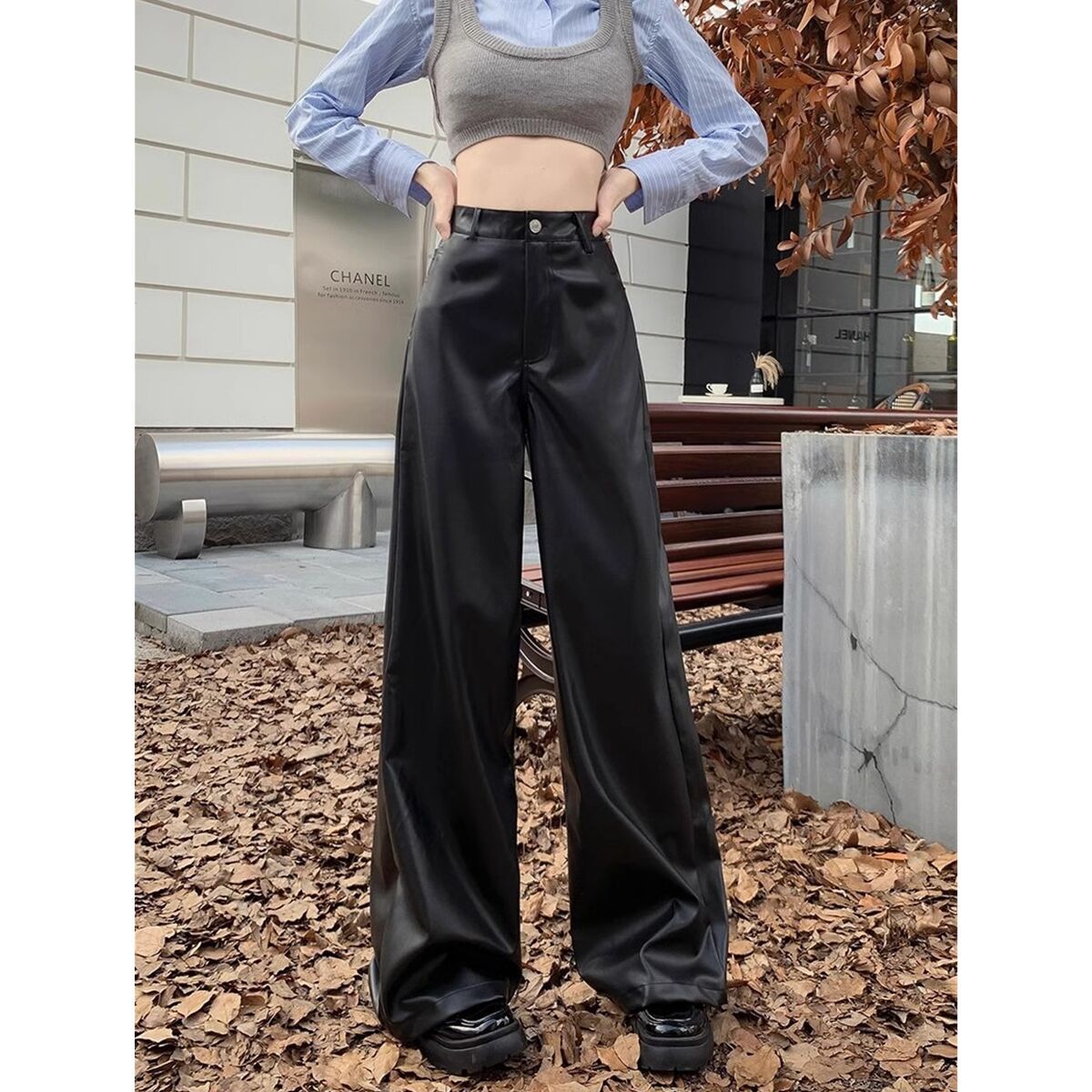 甘いクールな黒い広脚の皮のズボンの太ったmmのレトロなアメリカのpu皮のストレートのズボンの女性の秋冬の腰を緩めて地のズボンを引きずります。