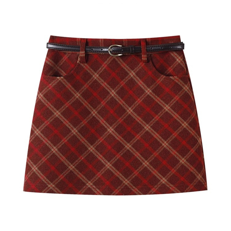 レトロな赤い格子縞の毛の半身のスカートの女性の太ったmmの秋冬は厚くてやせています。