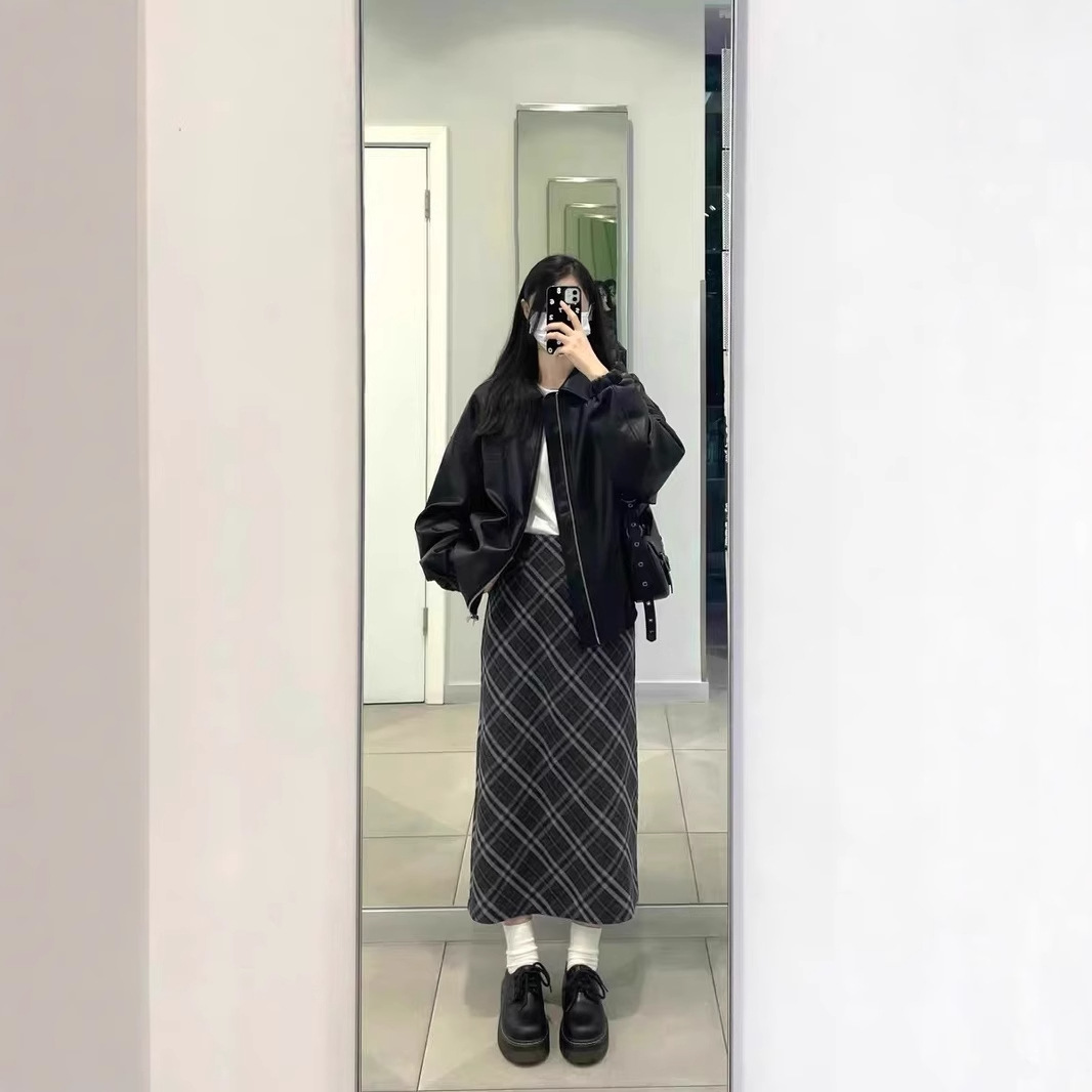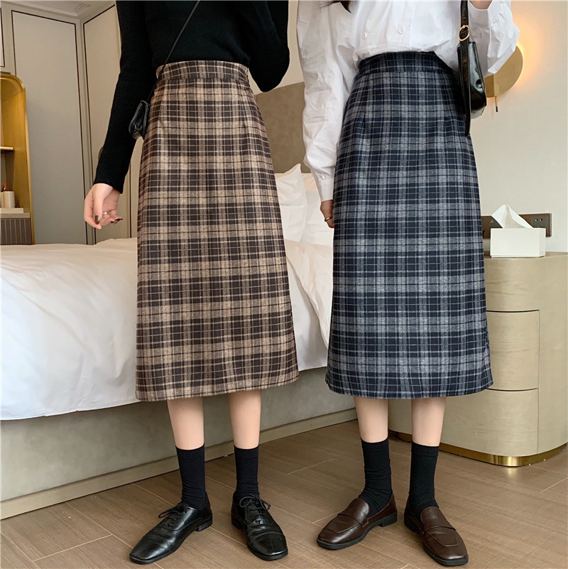 赤い毛の格子の半身のスカートの女性の秋冬の新型の大きいサイズの太っているmmはお腹を遮って見えます。