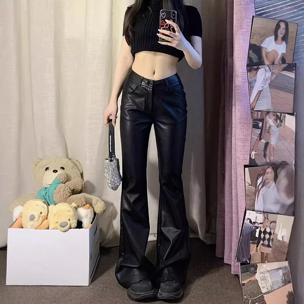 大きいサイズの太ったmmの美ラードのカレーの皮のズボンの女性の春と秋の冬の高腰の高級感のベルベットのpuの皮の防風の広い足のズボン