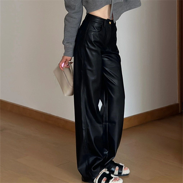 大きいサイズの太ったmmの黒いpuの皮のズボンの女性のゆったりしているストレートなズボンの秋の高い腰はやせている広腿のズボンの垂れ下がっている感じがします。