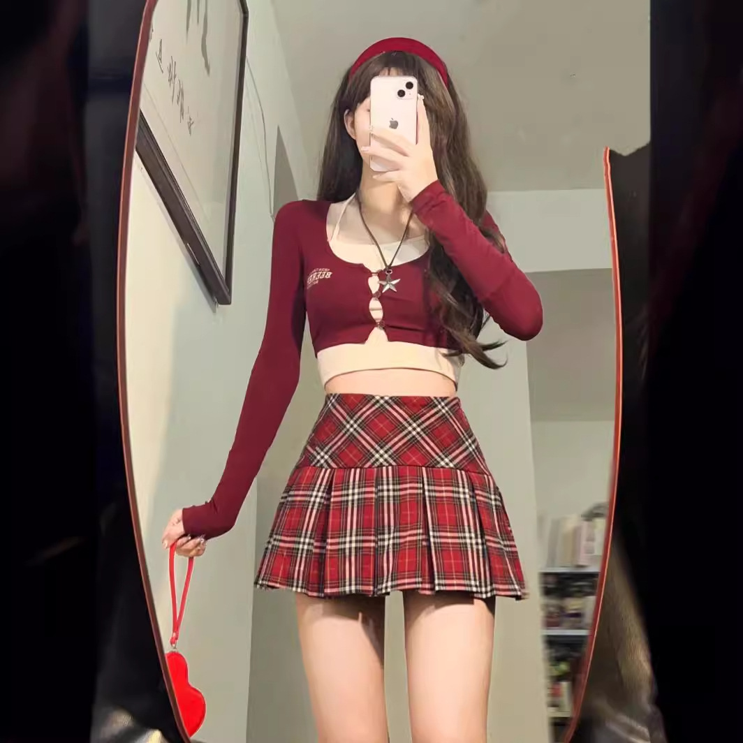 大きいサイズの赤い格子柄プリーツスカート レディース 秋 2024 新作 ハイウエストAラインショートスカート デザイン性のあるセクシーなスカート