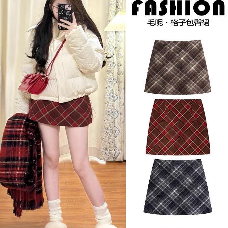 格子の毛の半身のスカートの女性の2024秋冬の新型のハイウエストのa字のスカートはやせている気質の小さい背がヒップのスカートを包みます