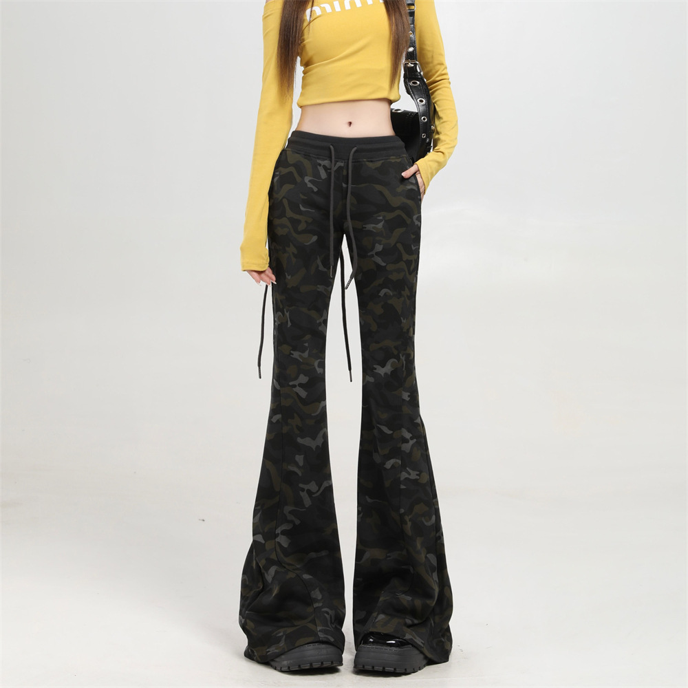 アメリカンレトロなダメージ加工迷彩巾着スウェットパンツ、少し太った女性用、春夏のホットガールデザインストレートレッグカジュアルパンツ