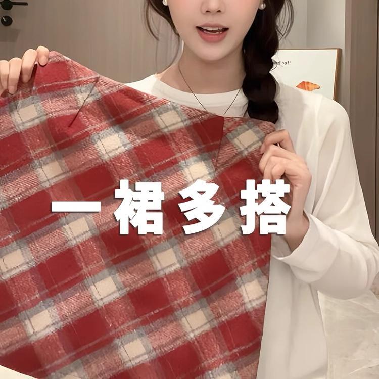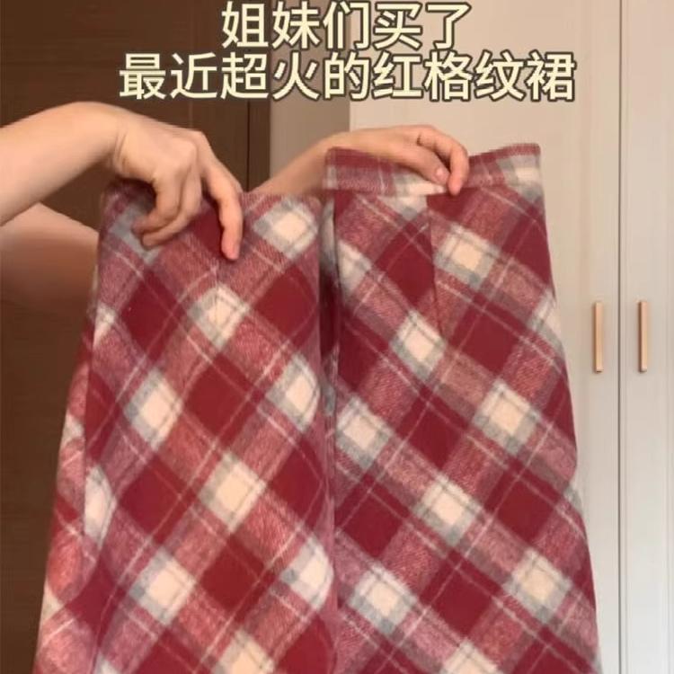 赤い格子の毛の半身のスカートの女性の秋冬の2024の新型の大きいサイズはやせて太っているmmがお尻のa字の中で長いスカートを包みます