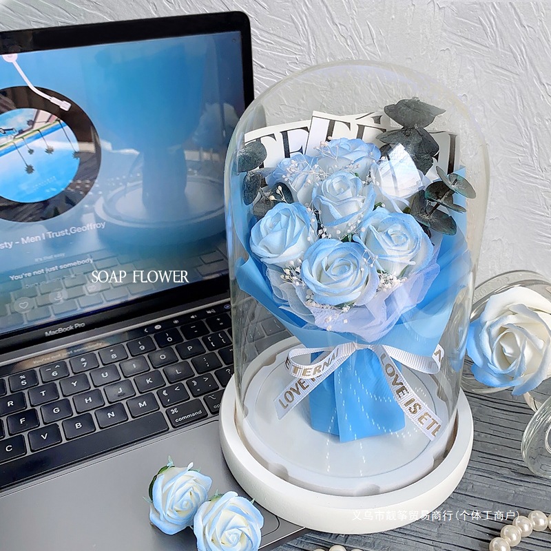 プリザーブドフラワー クラッシュアイスブルー ソープブーケ バラとベビーブレス バレンタインデーブーケ ガールフレンドへのギフト 女神の日の誕生日プレゼント