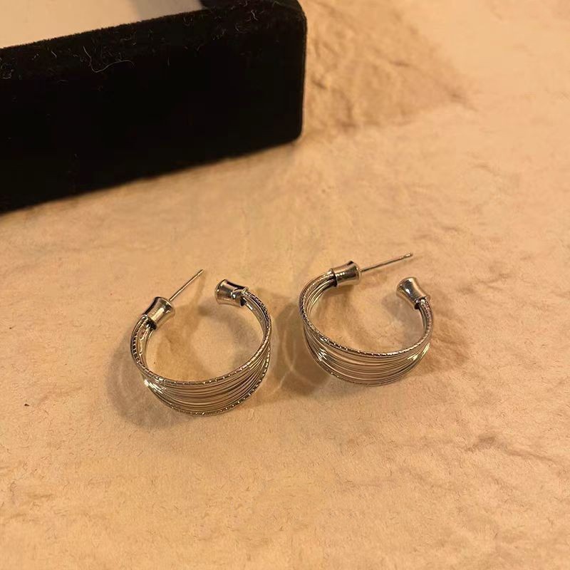 気品冷淡風小衆百合金属風銀色多層コイルc型イヤリング女性デザイン感シンプル耳飾り