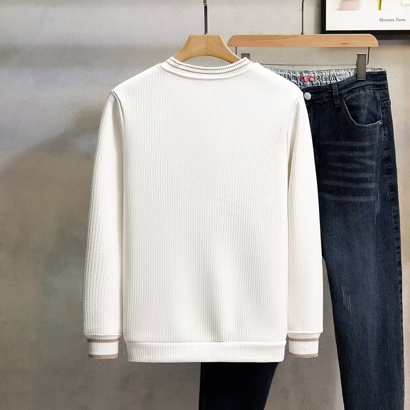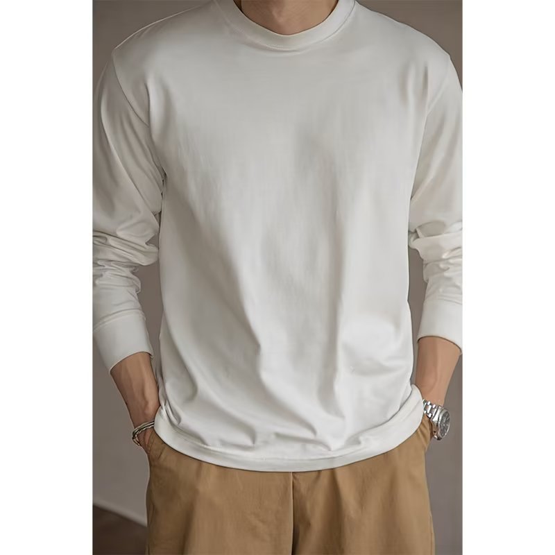 春の基礎は長袖のtシャツの男性の白い小さい襟元の丸首のゆったりしている日常の中で上着の黒色を掛けます。