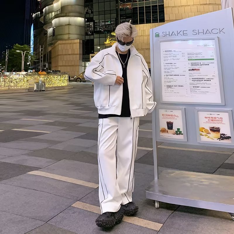 高級感のごろつきのかっこいいカジュアルなスポーツスーツの男性のゆったりとしたデザイン感のあるカーディガンのジャケットのワイドパンツと2つのセットのファッション