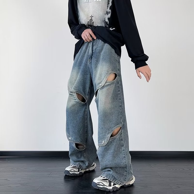 小衆解構造金属ボタンデザイン感ジーンズ男性ゆったりとした透かし彫りのワイドパンツ