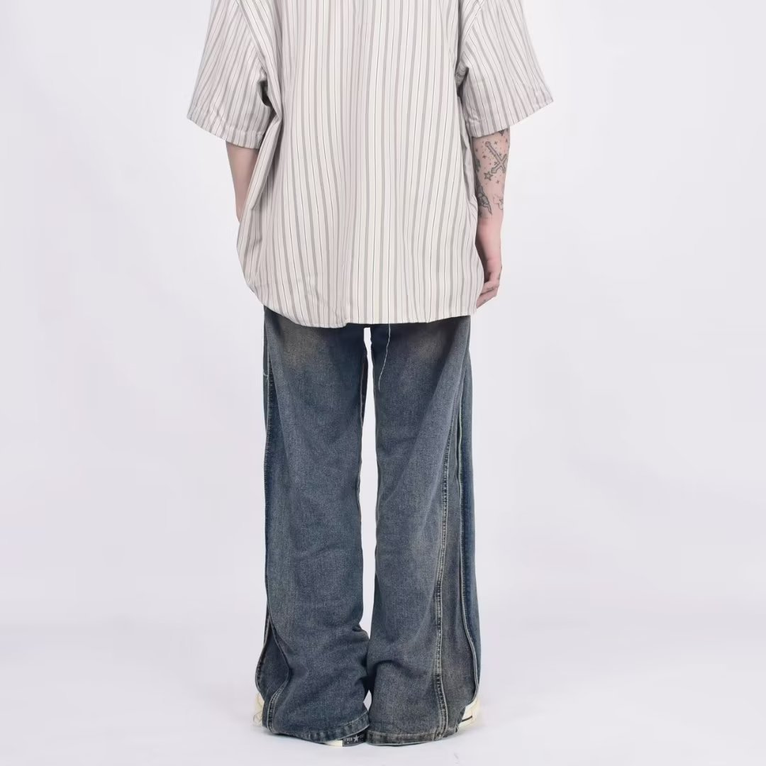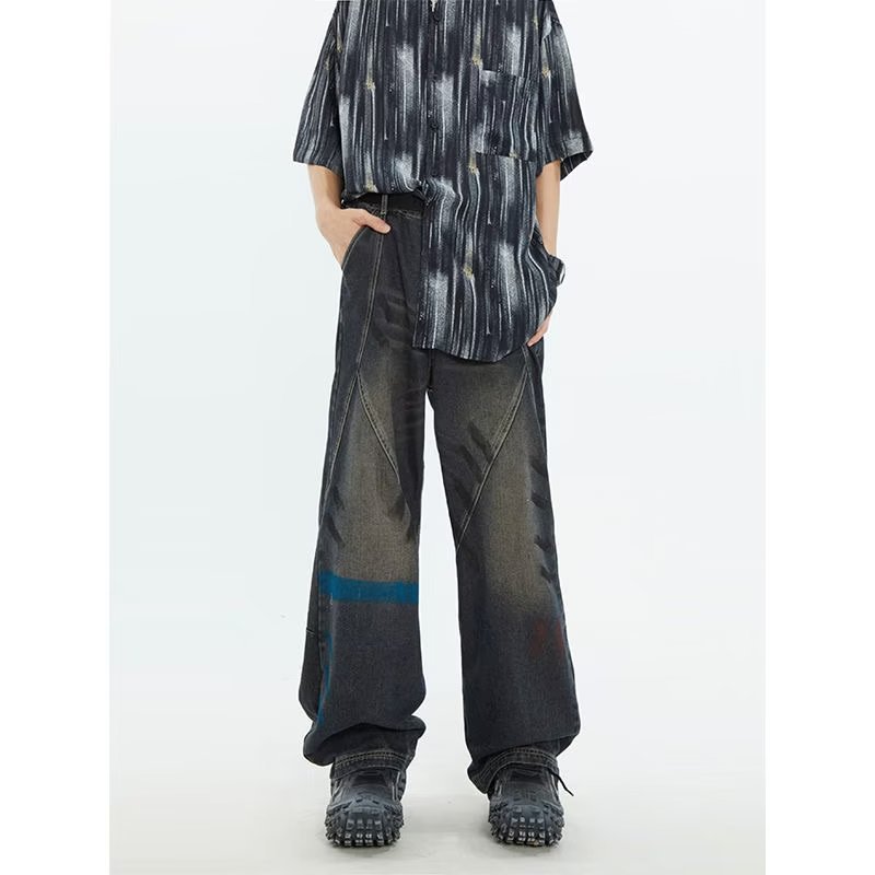 アメリカの街頭風のごろつきのハンサムなジーパンの男性のゆったりしている広足のまっすぐなズボンのvibeは水を洗って古いグラデーションの色のモップのズボンをします。