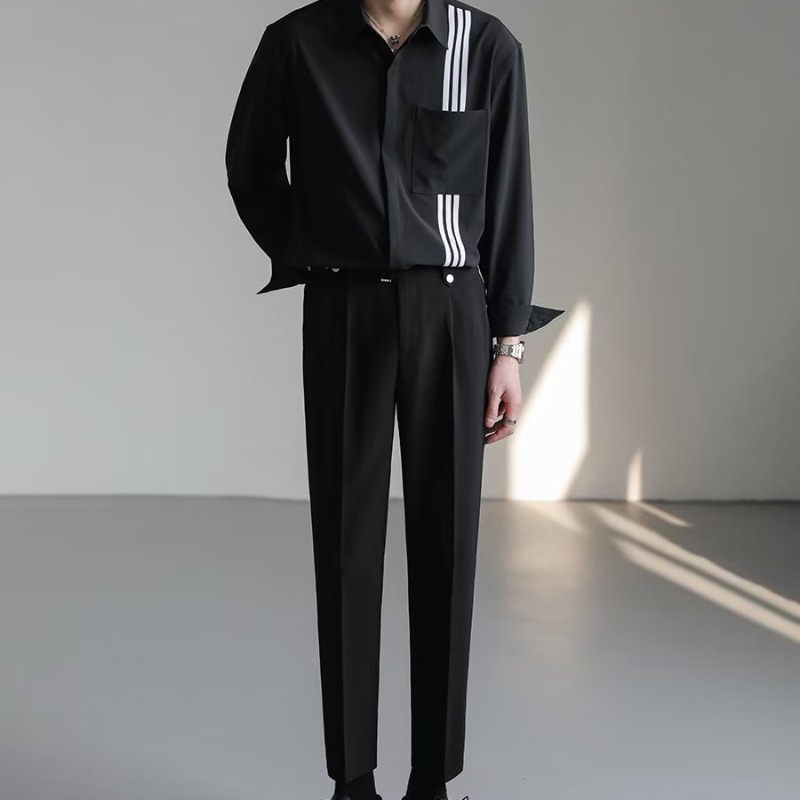 軽くて豪華なデザイン感の上着の韓国版のゆったりした長袖のシャツの男性の潮流のごろつきのかっこいいストライプの織布は熱いシャツを免除します。