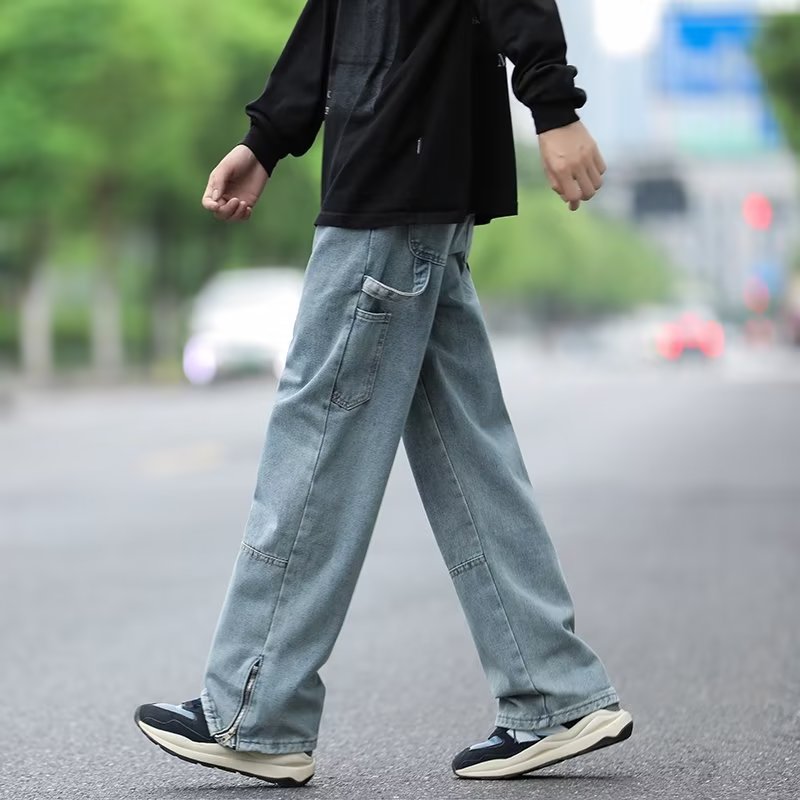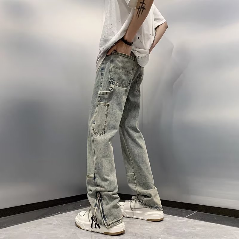 2023新型ゆるいストレートシンプルな国潮が古いジーンズを作っている男性カジュアルな街の街頭でズボンを引きずる