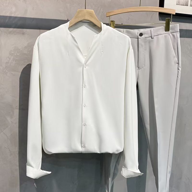 Vネック長袖白シャツメンズ日本風原宿風トレンドゆったりカジュアル高級感純色無襟シャツ