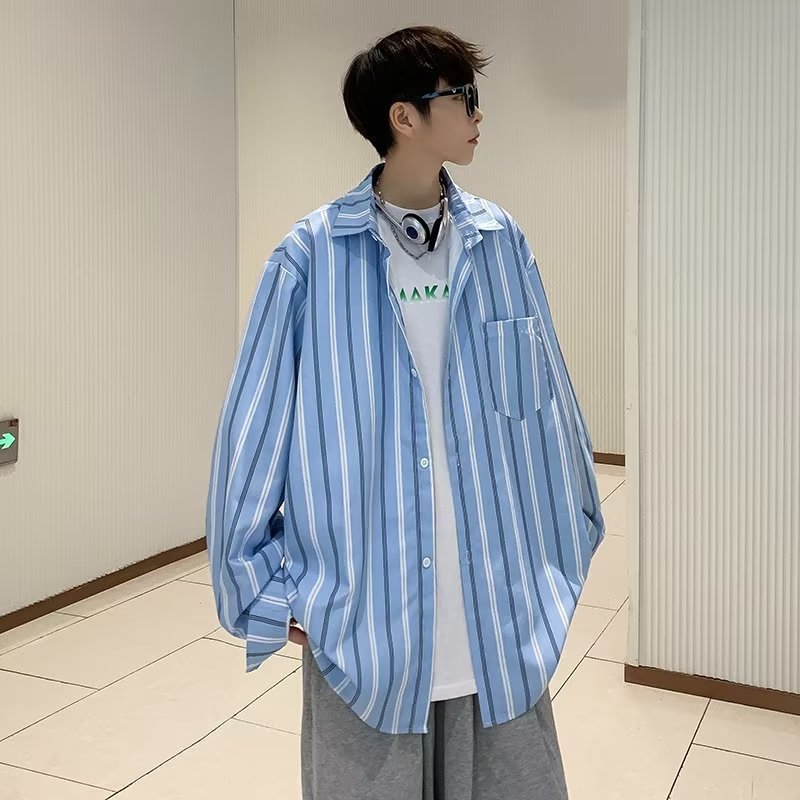 Overesizeストライプのシャツのコートの男性の薄いタイプのレトロなプリントの長袖の中性のゆったりしている怠惰な風のシャツの潮