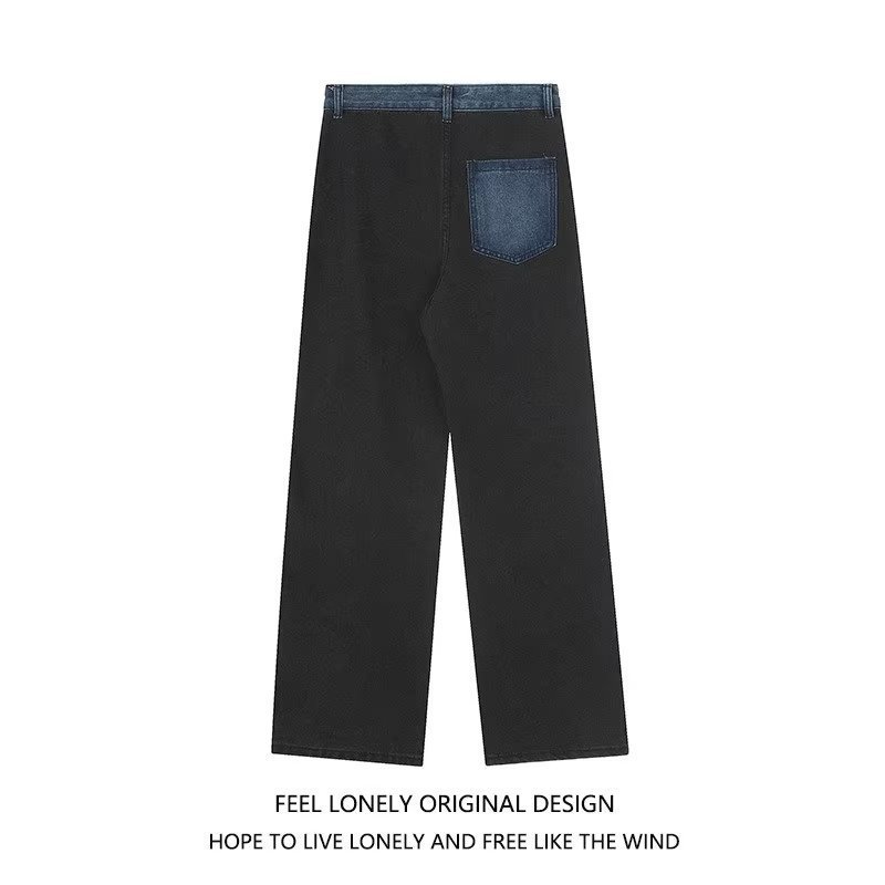 アメリカの高街の国の潮は不規則に色を合わせてジーパンの男性のカップルのinsのまっすぐな筒の広い足のズボンをつなぎ合わせます。