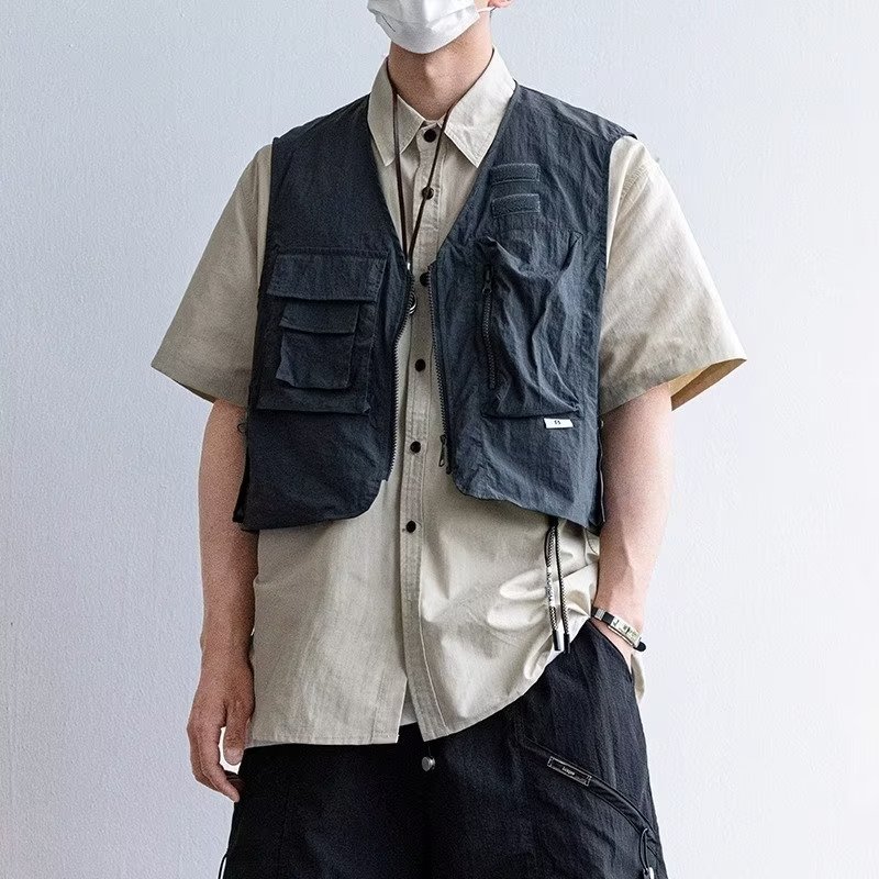 2023春夏新作工装突撃馬甲男ショートカジュアル肩ベストcity boyノースリーブコートブーム
