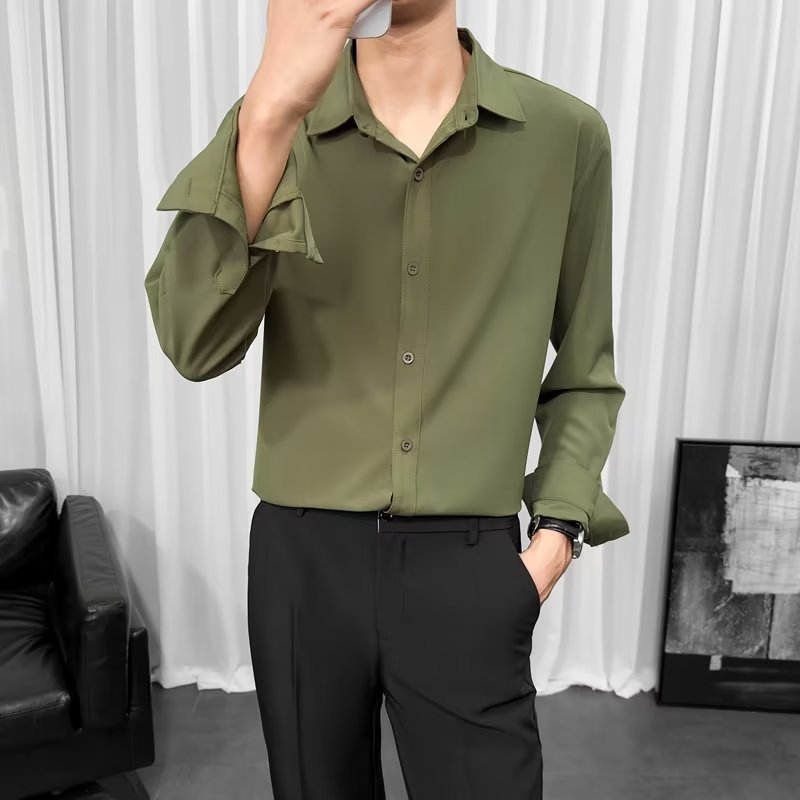 高品質の香港風のシャツの男性軍の緑の長袖の韓国版は上着を修理します。