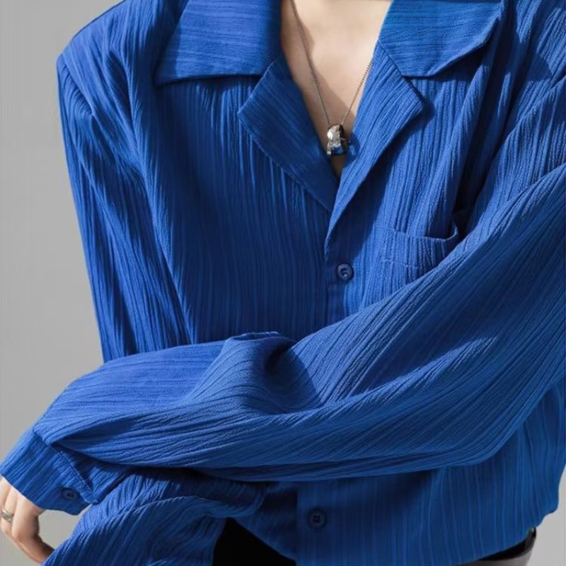 禁欲系クラインブルーシャツ男性垂れ下がった感じのスキューバネックのゆったりしたシャツは夏の日焼け止めに合わせて服を着ます。