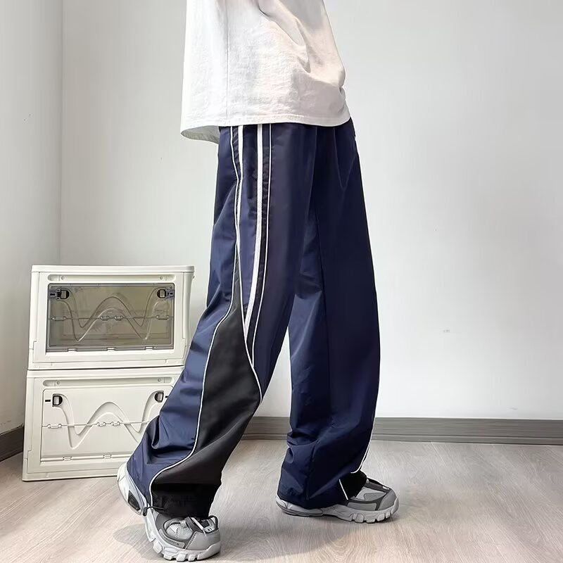 ストライプのズボンの男性のタイプの夏のアメリカの高い街のファッションのブランドのデザイン感の小さい大衆は色のまっすぐな筒のゆったりしているカジュアルなスポーツのズボンをつづり合わせます。
