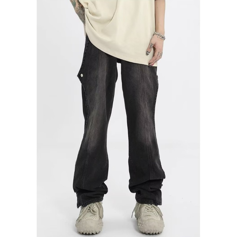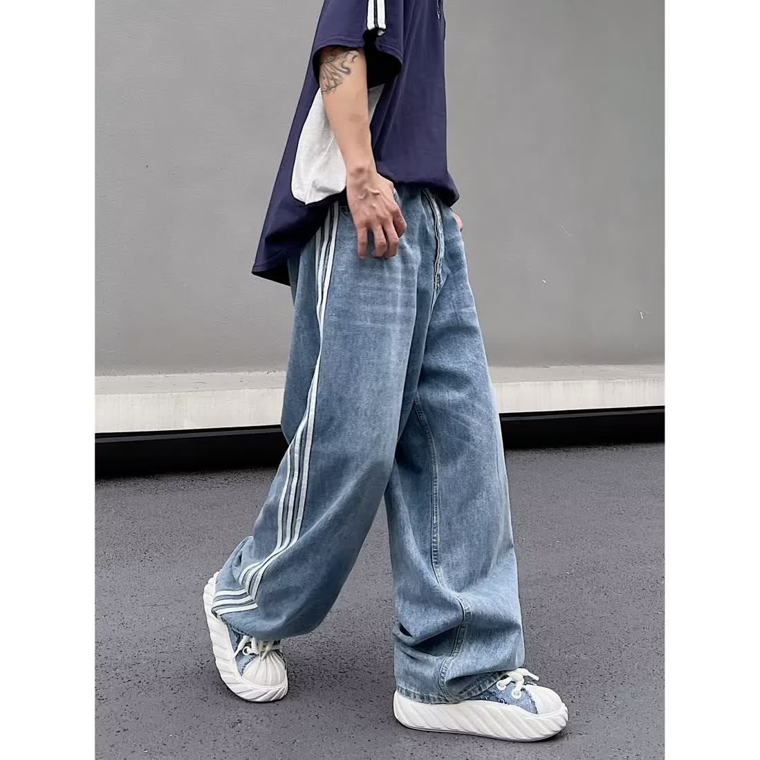 アメリカのレトロな街頭の三条のジーパンの男性の夏のゆったりしているカジュアルな百合のまっすぐな筒の広い足は地のズボンを引きずっています。